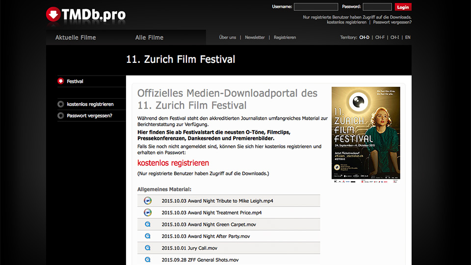 Here the Zurich Film Festival places its promo material for all festival films. Accredited journalists can download video footage, sound bites, interviews, photos and texts from individual films and events.